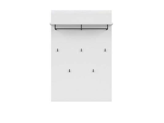Вешалка представляет собой вертикальный щит, на который крепятся полка, металлическая составная вешалка и металлические крючки. На верхней части вешалки крепится планка декоративная из МДФ в цвете "Белый блеск". Вешалка  крепится на стену при помощи кронштейнов. Максимальная нагрузка на вешалку до 5 кг На полке вы сможете разместить головные уборы, шарфы и т.д.