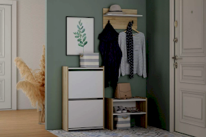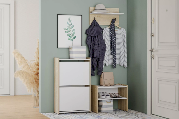 Тумба для обуви имеет стойкую конструкцию из двух закрытых секций с откидными полками, что позволяет хранить сезонную и повседневную обувь, а также убережет ее от пыли.