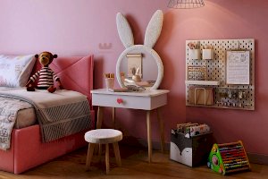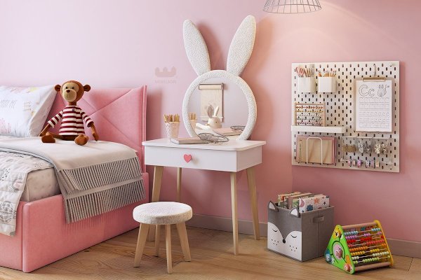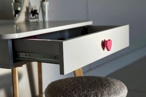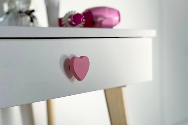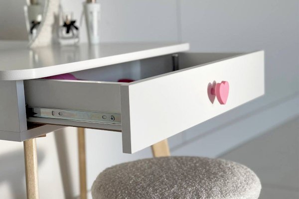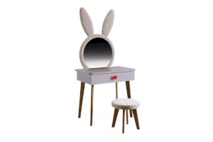 Комплект многофункционален: девочка может наводить красоту, смотрясь в круглое зеркало, мягкие уши из плюша можно использовать как крючки для украшений, на столешнице разложить все нужные и важные вещи для марафета или лепить из пластилина и рисовать. В выдвижной ящик на шариковых направляющих складывать необходимые вещи. Тактильно приятная на ощупь ручка в форме сердечка, ни кого не оставит равнодушным, к ней захочется прикасаться все снова и снова.
