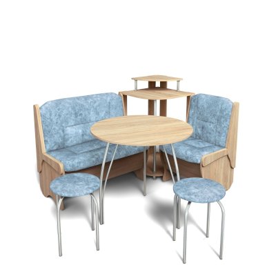 Оригинальный кухонный уголок Лотос отличается от других похожих кухонных гарнитуров. Он состоит из двух отдельных диванчиков и этажерки, заменяющей угловую мягкую часть. Круглый кухонный стол в отличие от других наборов мебели на металлическом основании как и два круглых табурета. Набор мебели для кухни включающий в себя большую прямую скамью,малую прямую скамью,угловую этажерку, стол на металлических ногах и два табурета на металлокаркасе. В прямых скамьях под сиденьями расположены ящики.